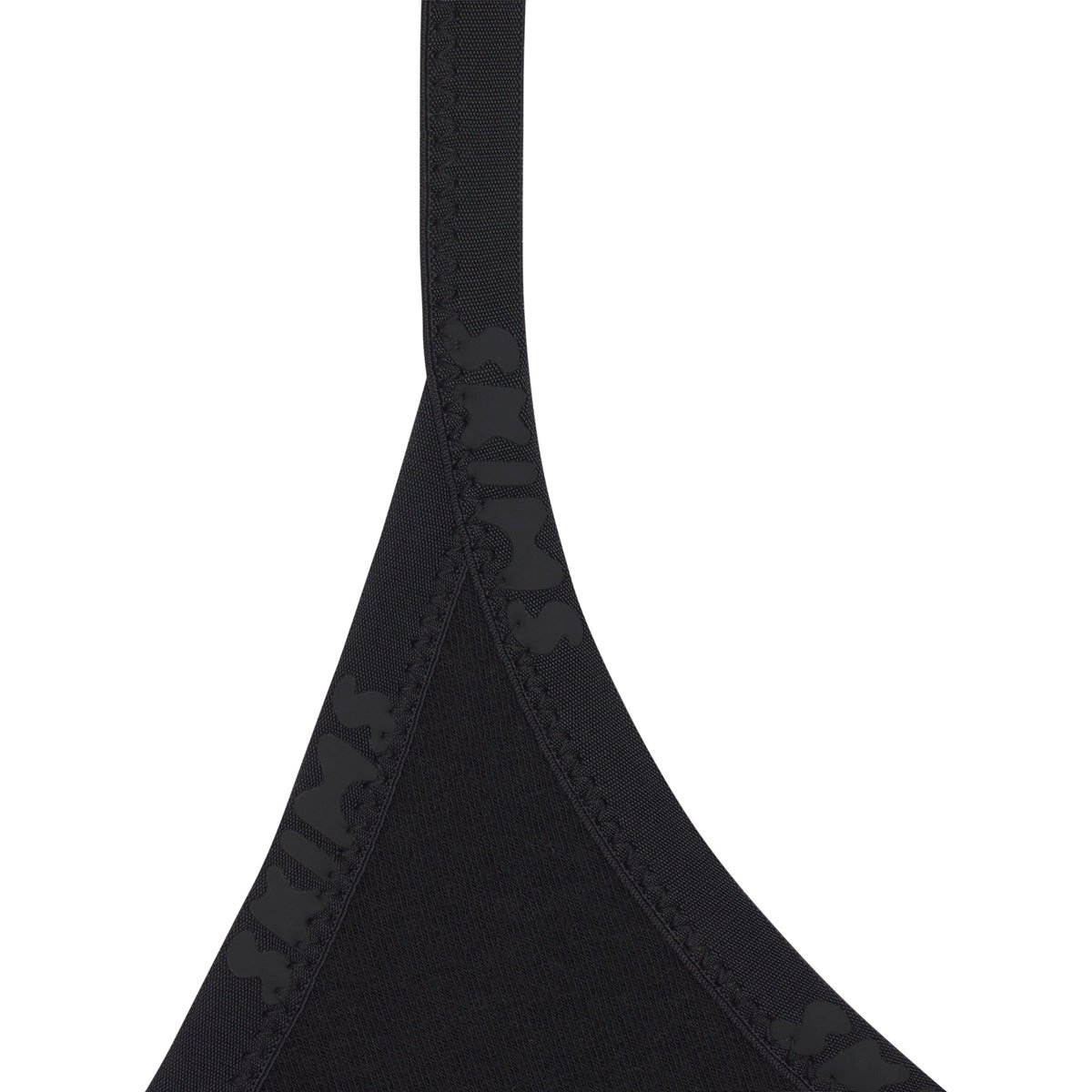 deep scoop front neckline, tonal rubberized logo detail along straps neckline and underband, adjustable straps, lined in self cotton jersey for softness, hook and eye back closure, perfect for layering or wearing on its own