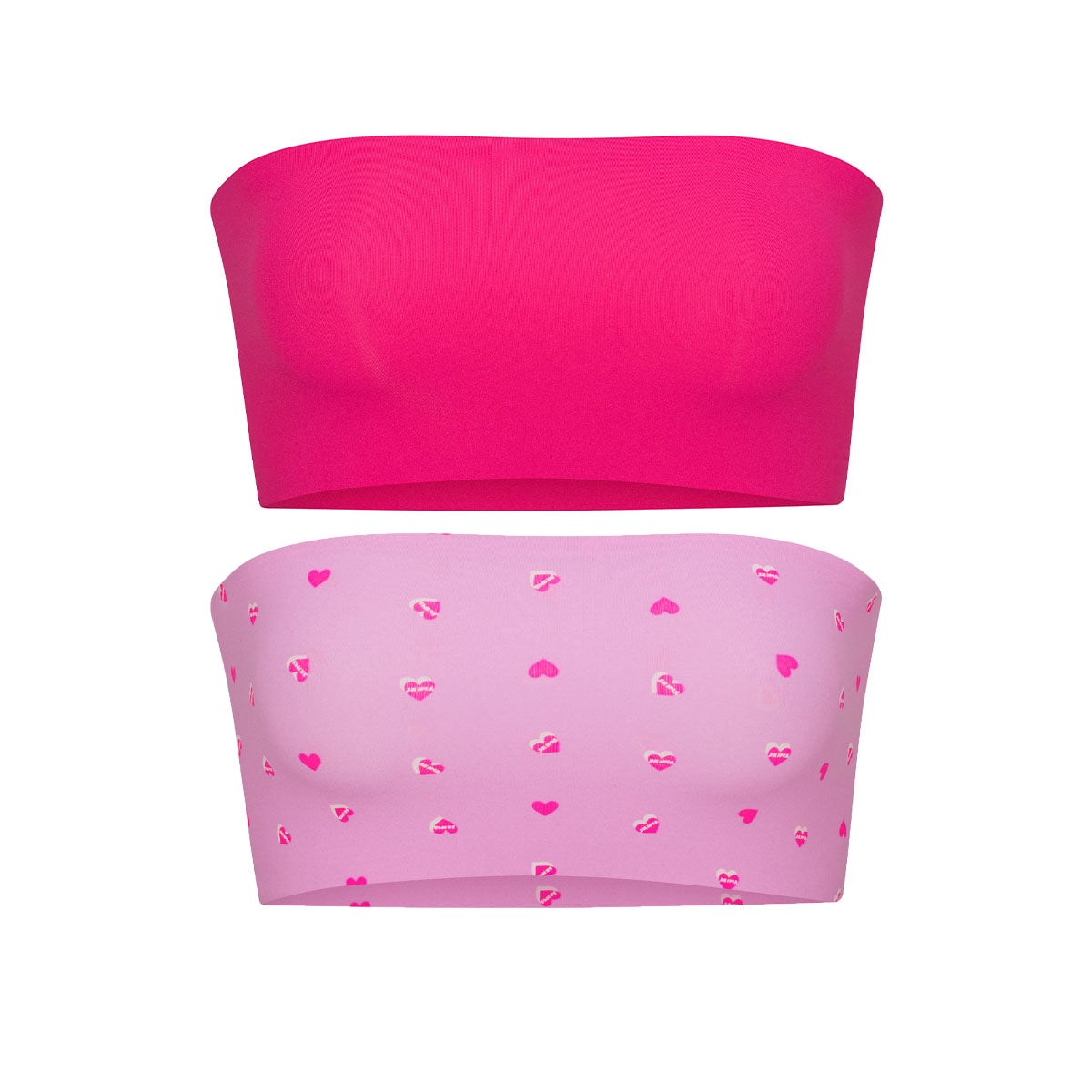 bandeau pack with seasonal colors and prints, straight neckline and strapless style, pullover style (no hook and eye), packaged in a gift box, each set contains 2 bralettes, neon rose & petal print