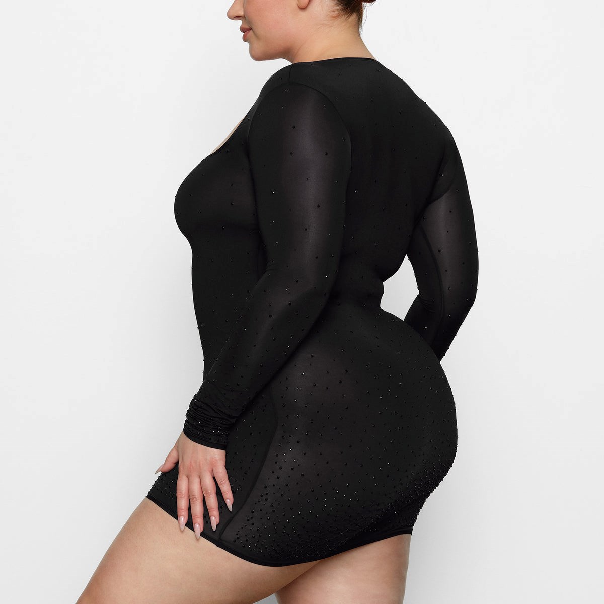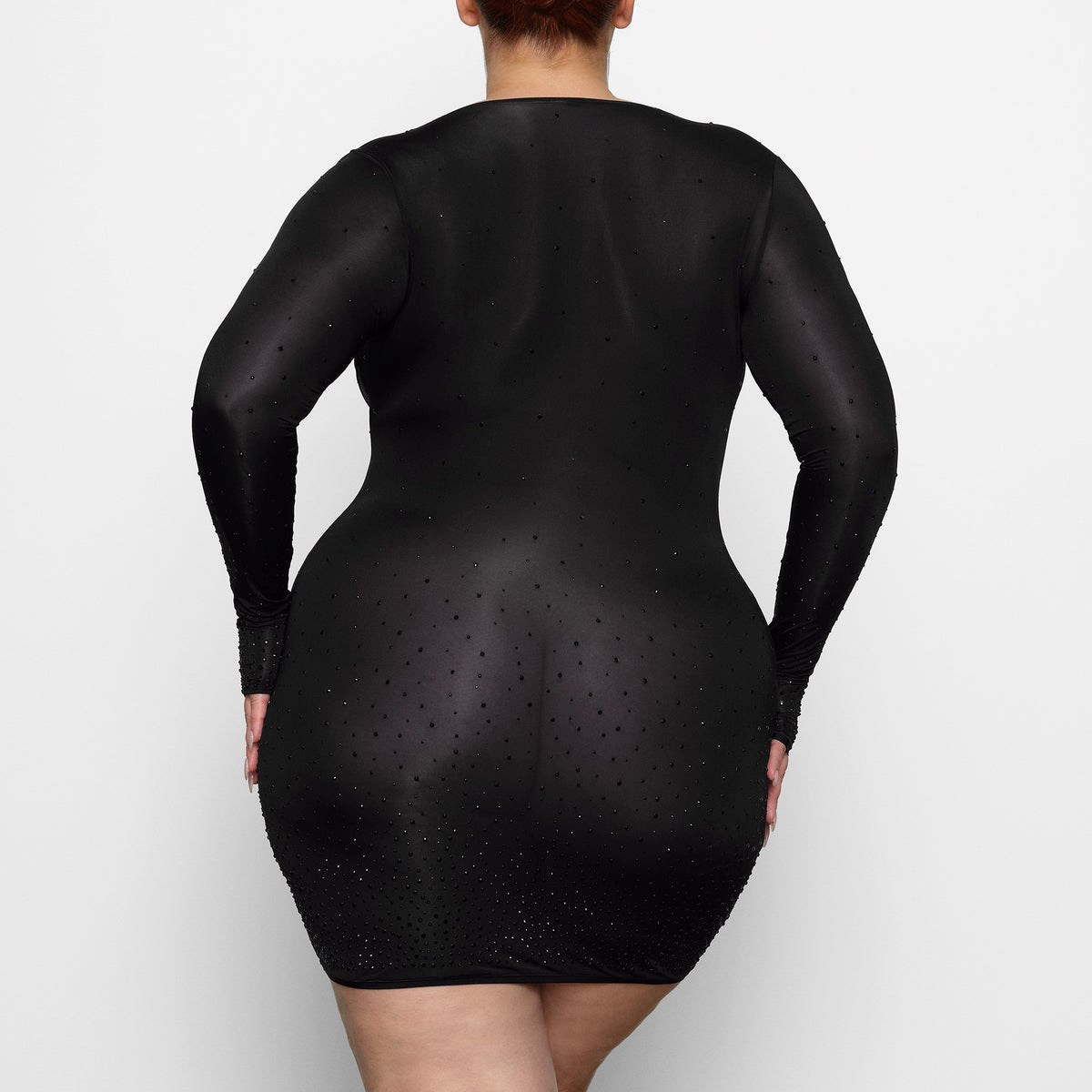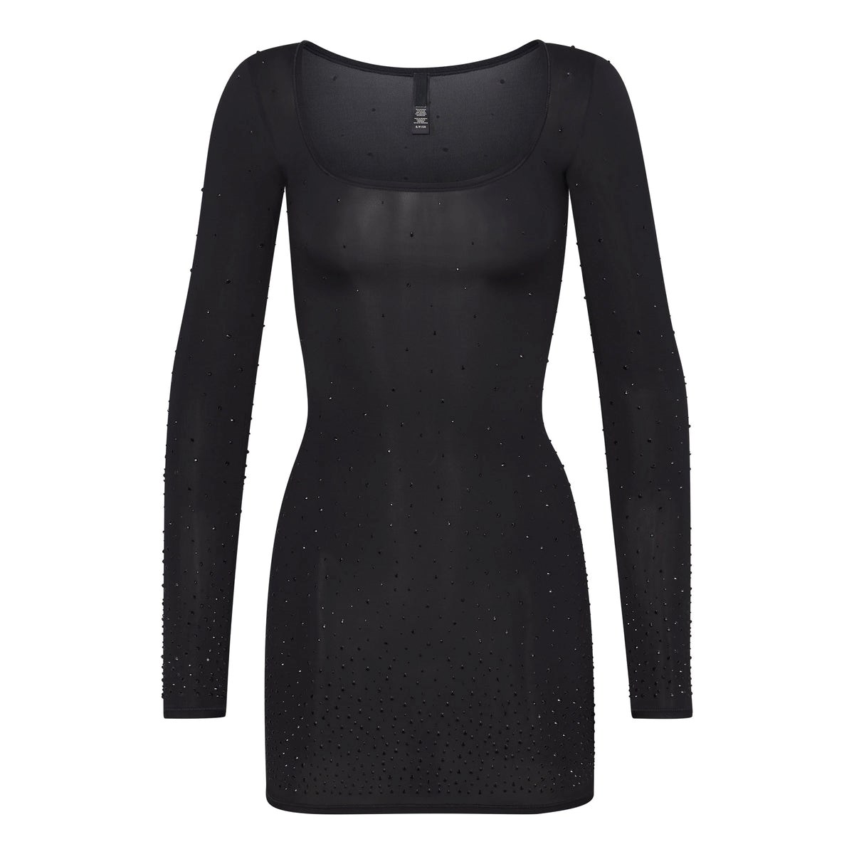 sheer long sleeve dress, open square neckline, gradient rhinestones along front and back, length = s: 30”, 2x: 32”